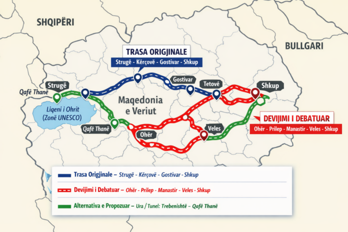 Në debatet e fundit politike është përmendur një alternativë që do ta devijonte korridorin drejt jugut të vendit: Ohër – Prilep – Manastir – Veles – Shkup. Një ndryshim i tillë nuk do të ishte thjesht teknik, por strategjik.
