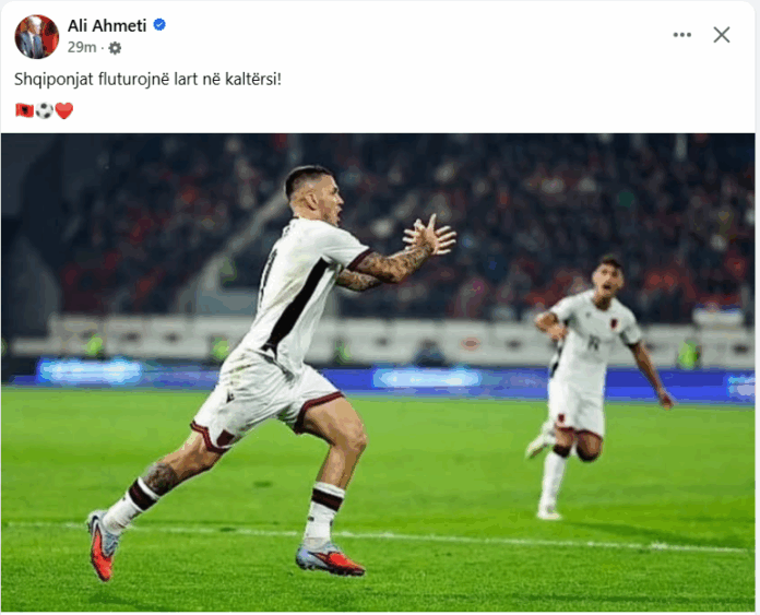 BallinaLajmeAli Ahmeti: Shqiponjat fluturojnë në kaltërsi LajmeMaqedoni Ali Ahmeti: Shqiponjat fluturojnë në kaltërsi By admin 11.10.2025 0 9 Share FacebookTwitterPinterestWhatsApp Share FacebookTwitterPinterestWhatsApp Artikulli paraprakSelektori i Sërbisë Dragan Stojkoviç -Piksi ,pas humbjes nga Shqipëria sonte dha dorëheqje /Unë jam fajtori …Artikulli tjetërFestojmë për Shqipërinë/ Ballistët e kallin Tetovën! (LIVE VIDEO) admin RELATED ARTICLES Lajme Festojmë për Shqipërinë/ Ballistët e kallin Tetovën! (LIVE VIDEO) 11.10.2025 Sport Selektori i Sërbisë Dragan Stojkoviç -Piksi ,pas humbjes nga Shqipëria sonte dha dorëheqje /Unë jam fajtori … 11.10.2025 Lajme Ambasadori i Shqipërisë në Shkup Denion Meidani i gëzohet golit të Shqipërisë në ndeshjen kundër Serbisë 11.10.2025 - Advertisment - Most Popular Festojmë për Shqipërinë/ Ballistët e kallin Tetovën! (LIVE VIDEO) 11.10.2025 Selektori i Sërbisë Dragan Stojkoviç -Piksi ,pas humbjes nga Shqipëria sonte dha dorëheqje /Unë jam fajtori … 11.10.2025 Ambasadori i Shqipërisë në Shkup Denion Meidani i gëzohet golit të Shqipërisë në ndeshjen kundër Serbisë 11.10.2025 Bajram Rexhepi: Duke ndjekur ndeshjen Sërbi–Shqipëri, s’munda mos të mendoj për “donacionin” serb 11.10.2025 Më shumë Recent Comments