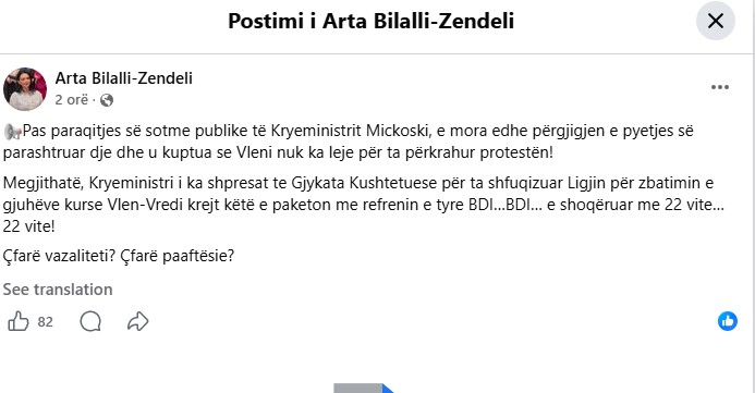 BallinaLajmeArta Bilalli Zendeli: Mickovski sot tregoi se nuk i ka dhënë leje... LajmeMaqedoni Arta Bilalli Zendeli: Mickovski sot tregoi se nuk i ka dhënë leje VLEN-it për të mbështetur protestën By admin 05.04.2026 0 11 Share FacebookTwitterPinterestWhatsApp Share FacebookTwitterPinterestWhatsApp Artikulli paraprakVLEN: Ali Ahmeti mes miteve të rrënuara, nga “Maxhar Telekomi” te pasuria partiake në qendër të TetovësArtikulli tjetërRMV / Zv/ministri i Arsimit, Sulejmani u drejtohet studentëve: Kujdes nga opozita pa busull dhe argatët e saj! admin RELATED ARTICLES Lajme Krahasim mes Protestat e studentëve në Prishtinë – Kosovë 1981 dhe situatës së sotme në RMV viti 2026 lidhur me protestën e paralajmëruar nga... 05.04.2026 Lajme RMV / Zv/ministri i Arsimit, Sulejmani u drejtohet studentëve: Kujdes nga opozita pa busull dhe argatët e saj! 05.04.2026 Lajme VLEN: Ali Ahmeti mes miteve të rrënuara, nga “Maxhar Telekomi” te pasuria partiake në qendër të Tetovës 05.04.2026 - Advertisment - Most Popular Krahasim mes Protestat e studentëve në Prishtinë – Kosovë 1981 dhe situatës së sotme në RMV viti 2026 lidhur me protestën e paralajmëruar nga... 05.04.2026 RMV / Zv/ministri i Arsimit, Sulejmani u drejtohet studentëve: Kujdes nga opozita pa busull dhe argatët e saj! 05.04.2026 VLEN: Ali Ahmeti mes miteve të rrënuara, nga “Maxhar Telekomi” te pasuria partiake në qendër të Tetovës 05.04.2026 10 km e “Shkup-Bllacë” do të ndërtohen nga kompani e vendit! Zekolli: Tenderi është për autostradë, jo për magjistrale 05.04.2026 Më shumë Recent Comments