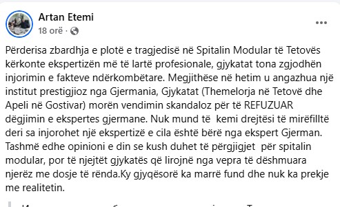 “ Nuk mund të ketë drejtësi të mirëfilltë përderisa injorohet një ekspertizë e realizuar nga ekspertë gjermanë”, shkruan Etemi, duke shtuar se tashmë edhe opinioni publik e di se kush duhet të mbajë përgjegjësi për spitalin modular.