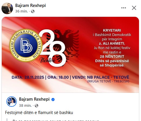 BallinaLajmeBajram Rexhepi / Festojmë ditën e flamurit së bashku LajmeMaqedoni Bajram Rexhepi / Festojmë ditën e flamurit së bashku By admin 27.11.2025 0 9 Share FacebookTwitterPinterestWhatsApp Share FacebookTwitterPinterestWhatsApp Artikulli paraprakAgeler për Korridorin 8 dhe 10/Ato janë me rëndësi kyçe për MaqedoninëArtikulli tjetërRekord në tregun e banesave: 3.070 euro për metër katror në Qendër – Shkup admin RELATED ARTICLES Lajme AKI: Poverenikët e jashtëligjshëm nuk ju kryejnë punë, përgjigjen do ta merrni nga populli më 11 janar 27.11.2025 Lajme Rekord në tregun e banesave: 3.070 euro për metër katror në Qendër – Shkup 27.11.2025 Lajme Ageler për Korridorin 8 dhe 10/Ato janë me rëndësi kyçe për Maqedoninë 27.11.2025 - Advertisment - Most Popular AKI: Poverenikët e jashtëligjshëm nuk ju kryejnë punë, përgjigjen do ta merrni nga populli më 11 janar 27.11.2025 Rekord në tregun e banesave: 3.070 euro për metër katror në Qendër – Shkup 27.11.2025 Ageler për Korridorin 8 dhe 10/Ato janë me rëndësi kyçe për Maqedoninë 27.11.2025 Siljanovska-Davkova: Na duhet Regjistër kombëtar i diasporës për ta ditur numrin e saktë të mërgimtarëve 27.11.2025 Më shumë Recent Comments