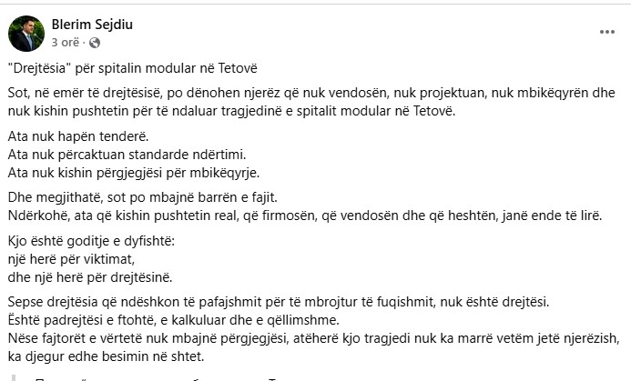 Blerim Sejdiu: Fajtorët e vërtetë po lihen të lirë, po ndëshkohen të pafajshmit për tragjedinë e spitalit modular në Tetovë