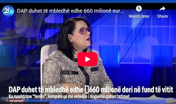 Rreth 660 milionë euro nga tatimet dhe kontributet duhet t’i mbledhë Drejtoria e të Ardhurave Publike deri në fund të këtij viti, për të realizuar planin buxhetor në anën e të ardhurave. Këtë në emisionin Biznes 21 e deklaroi drejtoresha e DAP-it, Elena Petrova. Megjithatë, këto janë vetëm të ardhurat që DAP duhet t’i mbledhë nga TVSH-ja, tatimi mbi të ardhurat personale dhe tatimi mbi fitimin, si dhe kontributet. Sipas Petrovës, deri në fund të nëntorit janë mbledhur 3 miliardë e 970 milionë euro.“Ky është realizim prej 91 për qind deri më 10 dhjetor, që do të thotë se për arkëtim kanë mbetur edhe 211.7 milionë euro, ndërkohë që përpara kemi saktësisht edhe 20 ditë. Te kontributet kemi të dhëna pak më të vjetra, deri më 30 nëntor. Aty plani vjetor është 2 miliardë e 190 milionë euro, ndërsa arkëtimi deri më 30 nëntor ka qenë 1 miliard e 737 milionë euro, që do të thotë se mbetet një diferencë prej rreth 450 milionë eurosh për realizim”, u shpreh drejtoresha e DAP, Elena Petrova.