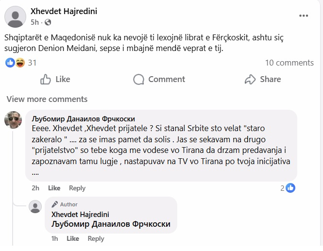 Në reagimin e tij, Fërçkoski ka zgjedhur një ton personal, duke i kujtuar Hajredinit “jaraninë” e dikurshme dhe bashkëpunimin mes tyre. “Eh Xhevdet shoku, si thonë serbët, për gjithçka po shet mend. Unë e mbaj mend një jaran tjetër. Kur më dërgoje të mbaj ligjërata në Tiranë dhe të njoftohem me njerëz atje – me iniciativën tënde”, ka shkruar ai.