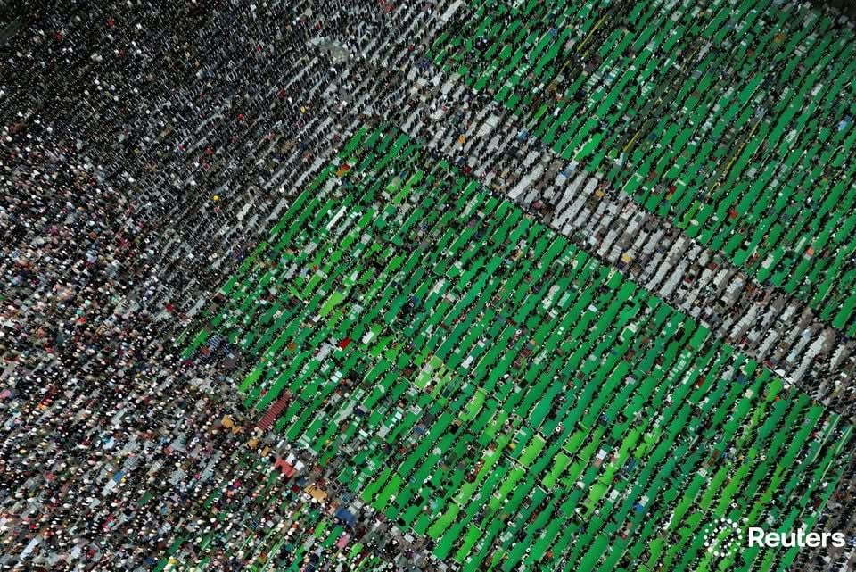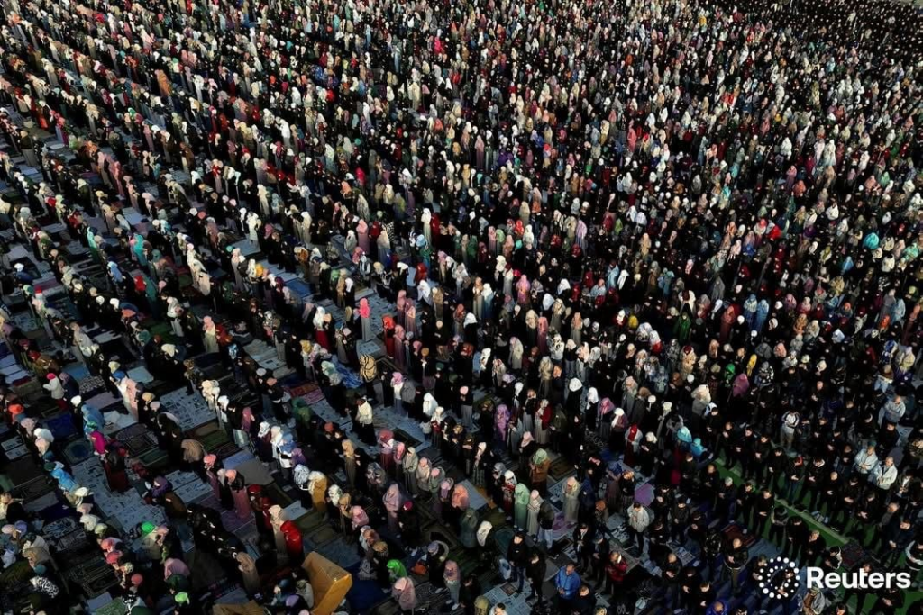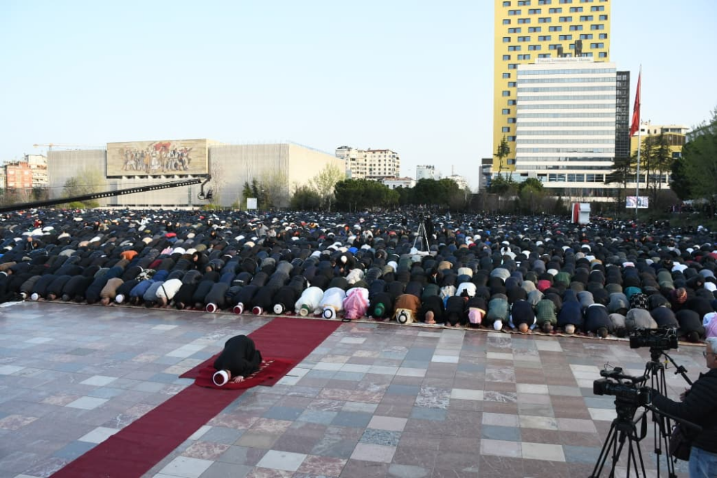 Në Tiranë, besimtarët kryen faljen e namazit në “Sheshin Skënderbej”.Disa pamje mahnitëse me dron u shpërndanë edhe nga fotografi i Reuters, Florion Goga, ku mijëra besimtarë myslimanë mbushin sheshin.