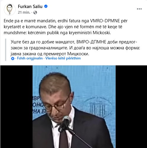 Ende pa e marrë mandatin, erdhi fatura nga VMRO-DPMNE për kryetarët e komunave. Dhe ajo vjen në formën më të keqe të mundshme: kërcënim publik nga kryeministri Mickoski.