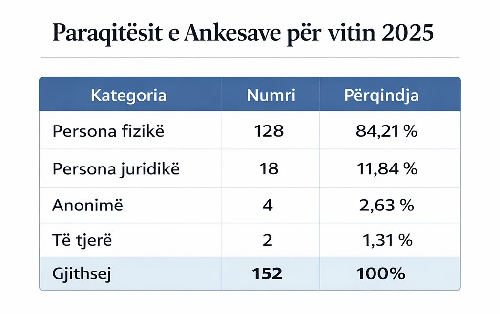 Nga numri i përgjithshëm, 128 ankesa janë paraqitur nga persona fizikë18 nga persona juridikë, 4 ankesa ishin anonime, ndërsa 2 ankesa janë paraqitur nga institucione apo subjekte të tjera si DAP, KSHPK, Agjencia e Kadastrës, noterë dhe të ngjashëm.