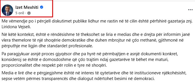 Izet Mexhiti u paraqit 5 orë pasi foli Mickoski në orën 11 për rastin e gazetares Liridona Vejseli.