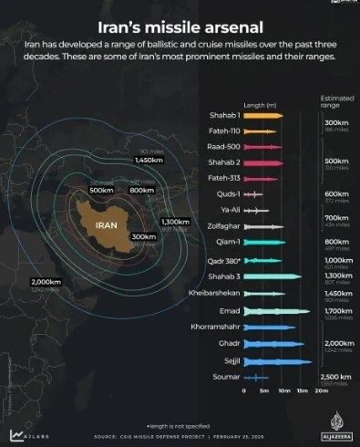 Zyrtarë izraelitë kanë publikuar një hartë të rrezes së raketave iraniane, ku pretendohet se mund të “arrijnë” edhe deri në Evropë, përfshirë edhe Ballkanin Perëndimor si Shqipërinë, Maqedoninë e Veriut, Kosovën, Malin e Zi, Sofjen, etj.Sipas tyre, raketat balistike iraniane kanë kapacitet që të arrijnë qëllime jo vetëm në Lindjen e Mesme, por edhe thellë në Evropë.