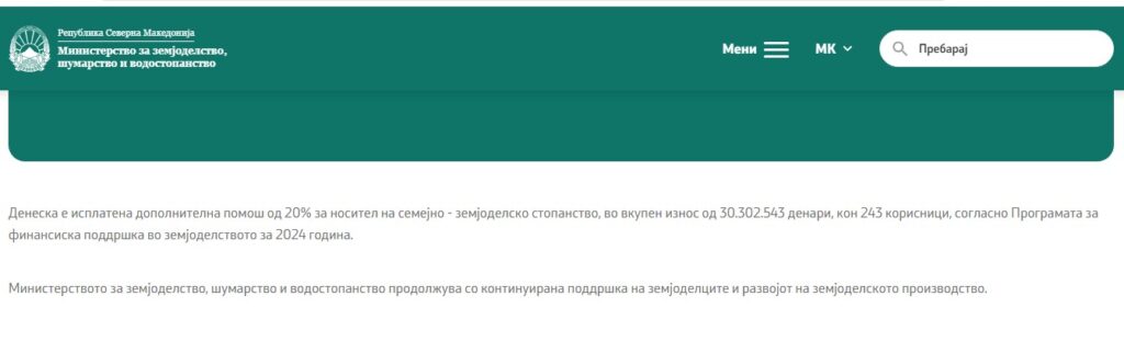 Ministria njoftoi se janë paguar mbi 30 milionë denarë mbështetje shtesë për 243 bartës të ekonomive familjare bujqësore, në kuadër të Programit për mbështetje financiare në bujqësi për vitin 2024. Megjithatë, në këtë njoftim mungon një element thelbësor për transparencën: nuk bëhet e ditur se nga cilat rajone apo komuna vijnë përfituesit e kësaj mbështetjeje.