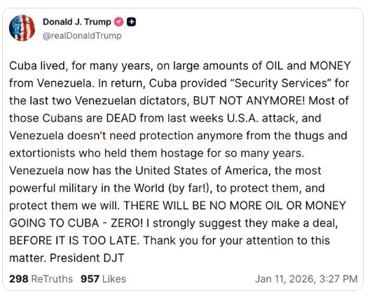 Trump vuri në dukje se Kuba ka mbijetuar për shumë vite falë sasive të mëdha të naftës dhe parave që vinin nga Venezuela. Venezuela është furnizuesi më i madh i naftës për Kubën, por pas arrestimit të Nicolás Maduro nga forcat amerikane, Trump po ushtron presion mbi presidenten e përkohshme të Venezuelës, Delcy Rodríguez, që nafta venezueliane të dërgohet në Shtetet e Bashkuara.CIA vlerëson se sektorë kyç të ekonomisë kubane, si bujqësia dhe turizmi, po përballen me presion të madh për shkak të ndërprerjeve të shpeshta të energjisë, sanksioneve tregtare dhe problemeve të tjera.