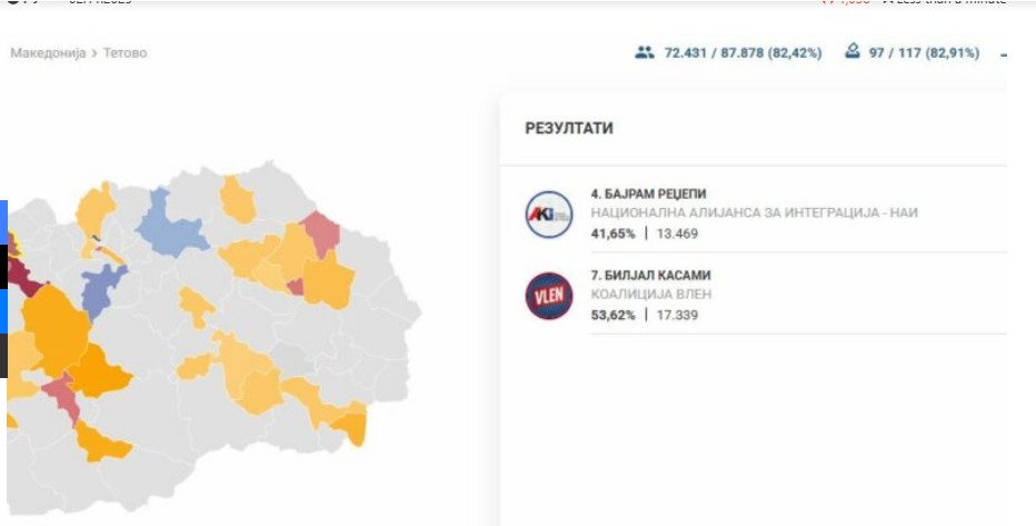 Nga numërimi i 82.91 për qind të votave në 97 nga gjithsej 117 vendvotime, në Tetovë prin Bilall Kasami nga VLEN me 53,62%, përcjell TV21. Kundër kandidati i tij, Bajram Rexhepi ka 41,65% të votave. Deri në këto momente, sipas KSHZ-së, Kasami ka 17,339 vota, ndërsa Rexhepi 13,469 vota.