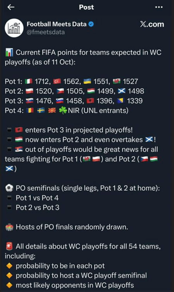 Një fitore ndaj Andorrës në nëntor, thuajse do të siguronte pjesëmarrjen në fazën “play off”, për Botërorin, megjithëse një kualifikim në fazën finale duket i vështirë.Ndarja e vazove, do të bëhet në muajin nëntor sipas pikëve dhe renditjes së FIFA-s. Megjithatë, llogaritë e para kanë nisur.