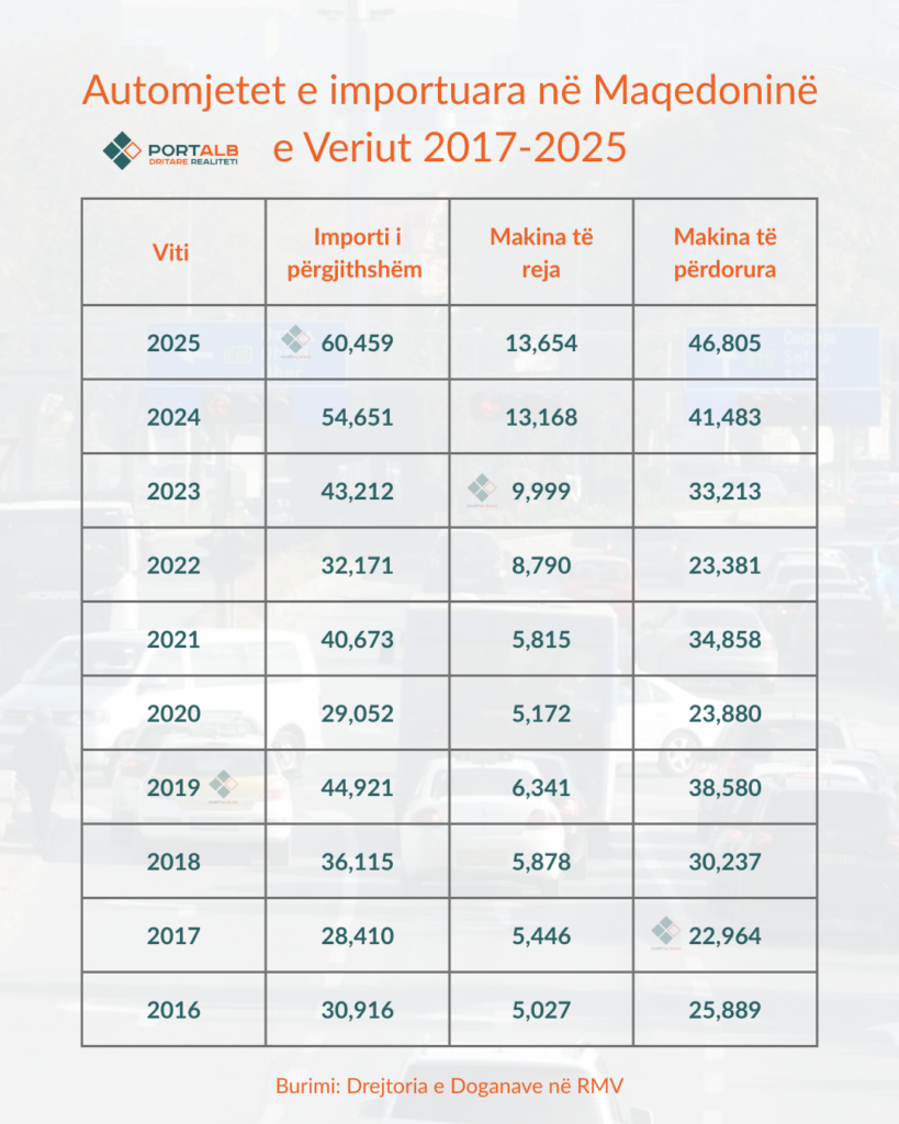 Sipas të dhënave të Drejtorisë së Doganave në vitin 2025 Maqedonia e Veriut ka regjistruar një import rekord të automjeteve – 69.400. Këtu bëjnë pjesë makina, kamionë dhe autobusë. Nga këto numri më i madh ose 60.459 janë makina, nga të cilat 77,4% janë automjete të përdorura, ndërsa pjesa tjetër janë të reja.