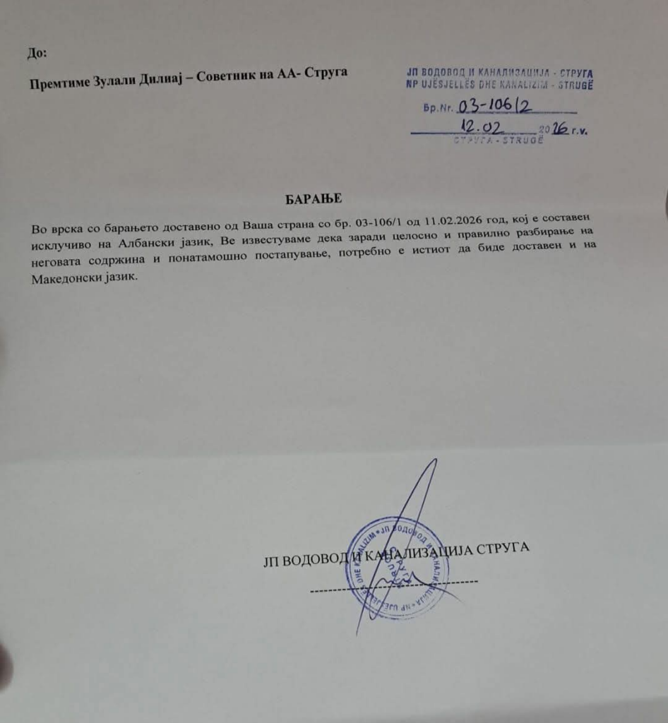 “Fol maqedonisht” është pergjigja e institucioneve të Komunës së Strugës, thua ti se i jam drejtuar Komunës së Kraljevës e jo Komunës së Strugës!