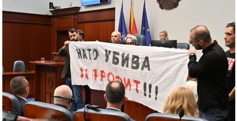 Sekretari i Përgjithshëm i NATO-s, Mark Rutte, gjatë agjendës së sotme në Shkup, vizitoi presidenten Gordana Siljanovska-Davkova, u takua me kryeministrin Hristijan Mickoski dhe shkoi në Parlament, ku deputetët e partisë opozitare “LEVICA” (E Majta”) e pritën me një mesazh.Ekstremistët nacionalistë në opozitë, të cilët përfaqësohen nga 6 deputetë, shpalosën një banderolë të madhe përpara podiumit, ku shkruhej “NATO vret për përfitim”.