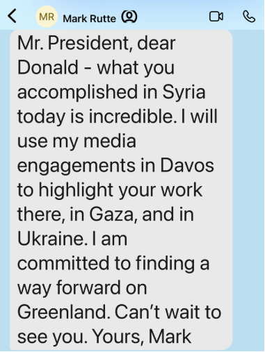 Në mesazhin që i atribuohet Rutte-së, thuhet se shefi i NATO-s i uron Trumpit për arritjet e tij në Siri dhe se do t’i përdorë paraqitjet e tij në media në Davos për të theksuar angazhimin e Trumpit në Siri, Gaza dhe Ukrainë. Rutte gjithashtu shkruan se është i përkushtuar për gjetjen e një zgjidhjeje për çështjen e Grenlandës dhe mezi pret ta takojë Trumpin.