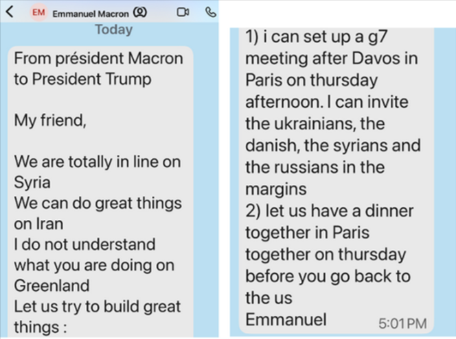 Presidenti francez shkruan në të se ata janë plotësisht të sinkronizuar për Sirinë, se së bashku mund të arrijnë “gjëra të mëdha për Iranin”, por se nuk kupton çfarë po bën Trump për çështjen e Grenlandës.Macron propozon organizimin e një takimi në formatin e G7 në Paris pas Davosit dhe sugjeron që në pjesën joformale të përfshihen përfaqësues nga Danimarka, Ukraina, Siria dhe Rusia