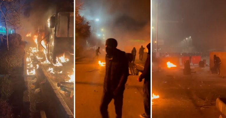 Një video, që supozohet se është filmuar në qytetin lindor të Mashhadit, tregon një ndërtesë të përfshirë nga flakët, e ndjekur nga protestuesit që kërkojnë strehim pas rrënojave dhe barrikadave të improvizuara në rrugë.