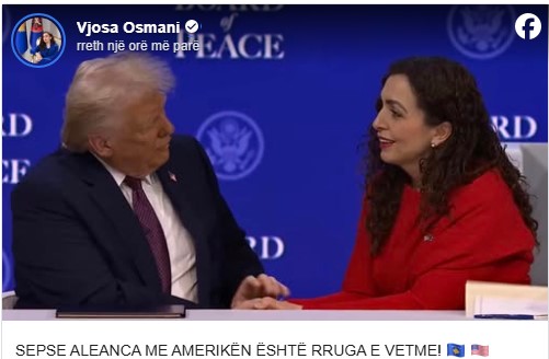 Presidentja e Kosovës, Vjosa Osmani, ka ndarë një foto në profilin e saj në Facebook, me presidentin e Shteteve të Bashkuara të Amerikës, Donald Trump, nga momenti i nënshkrimit të kartës së Bordit të Paqes.Në postimin e saj ajo ka shkruara se rruga e vetme është aleanca me Amerikën.