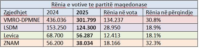 “Rënia e VMRO-DPMNE-së është e jashtëzakonshme – 135.000 vota më pak, që përbëjnë 30.8% të votave, ndërsa ZNAM bie nga 56.200 në 38.034 vota, duke humbur 33% të mbështetjes dhe duke u cilësuar si humbësi më i madh. Në të kundërt, LSDM ka humbur vetëm 18% të votave, çka – duke pasur parasysh pjesëmarrjen më të ulët në zgjedhje – pothuajse nuk përbën humbje reale. Partia Levica, e cila dje gënjeu në mënyrë triumfaliste duke pretenduar se po bëhej lidere e opozitës, ka humbur po të njëjtin përqindje votash si LSDM, me një përmirësim të lehtë vetëm në nivel të qytetit të Shkupit. Në total, Levica ka 2.2 herë më pak vota se LSDM, gjë që tregon se deklaratat e euforike të Apasievit nuk kanë asnjë lidhje me realitetin”.
